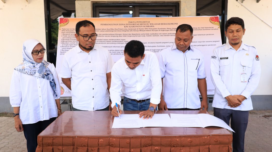 Ketua, Anggota, serta jajaran Sekretariat KPU Kabupaten Sumbawa melaksanakan penandatanganan Pakta Integritas sebagai langkah konkret dalam percepatan Pembangunan Zona Integritas menuju Wilayah Bebas dari Korupsi (WBK) di lingkungan KPU Kabupaten Sumbawa. Kegiatan ini menjadi komitmen bersama untuk meningkatkan profesionalitas, transparansi, akuntabilitas, serta menegaskan sikap anti-korupsi dalam penyelenggaraan pelayanan publik dan kepemiluan. Melalui penandatanganan ini, seluruh pegawai bertekad menjaga integritas, menghindari praktik penyimpangan, serta memberikan pelayanan terbaik kepada masyarakat. KPU Kabupaten Sumbawa berharap implementasi Zona Integritas dapat memperkuat kepercayaan publik terhadap lembaga penyelenggara pemilu melalui tata kelola organisasi yang bersih dan berintegritas tinggi. Pelaksanaan berjalan dengan tertib dan penuh komitmen, menandai langkah nyata dalam mendukung reformasi birokrasi dan pelayanan publik yang bebas dari korupsi. ....