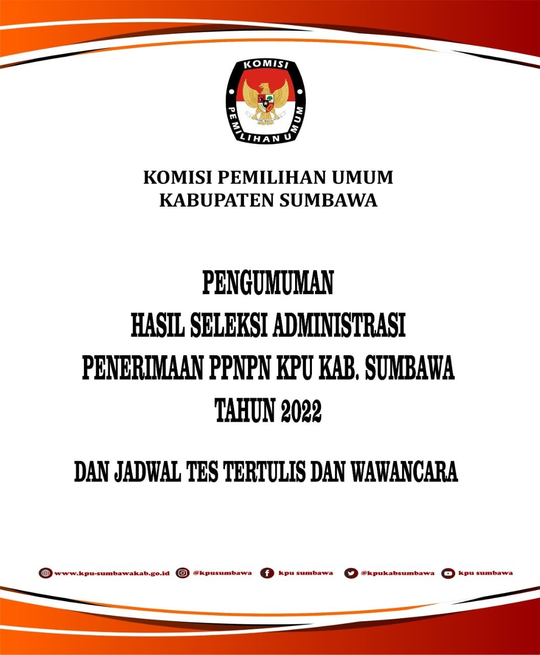 Pengumuman Hasil Seleksi Administrasi PPNPN KPU Kabupaten Sumbawa Jumat, 07 Januari 2022 00:00 1538 Pengumuman Hasil Seleksi Administrasi, Jadwal Tes Tertulis dan Wawancara Penerimaan PPNPN KPU Kabupaten Sumbawa DOWNLOAD DISINI Baca Selengkapnya
