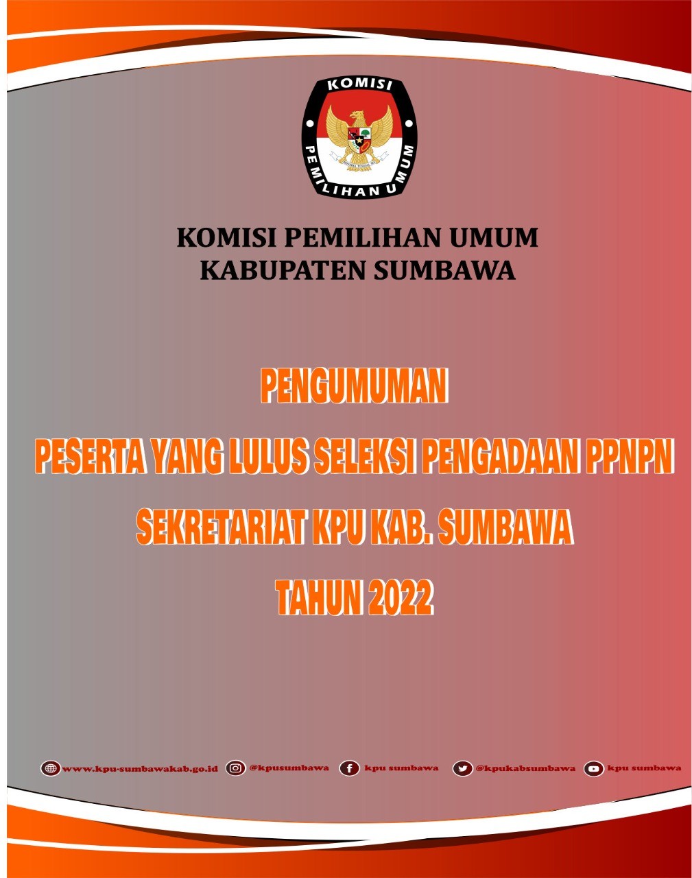 Peserta yang dinyatakan Lulus Seleksi Pengadaan Pegawai Pemerintah Non Pegawai Negeri (PPNPN) Sekretariat Komisi Pemilihan Umum Kabupaten Sumbawa Tahun 2022 Rabu, 12 Januari 2022 00:00 1921 Download File Baca Selengkapnya